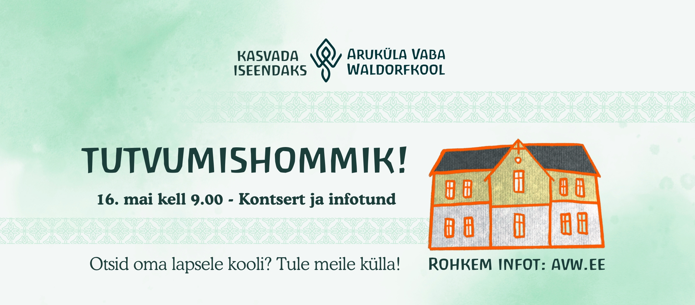 Aruküla Vaba Waldorfkooli tutvumishommik Otsid oma lapsele kooli? Tahaks teada Waldorfi kooli võimalustest? Tule meile külla! Ootame kõiki 16. mai hommikul tutvuma meie kooliga. Kell 9 algab kontsert, millele järgneb